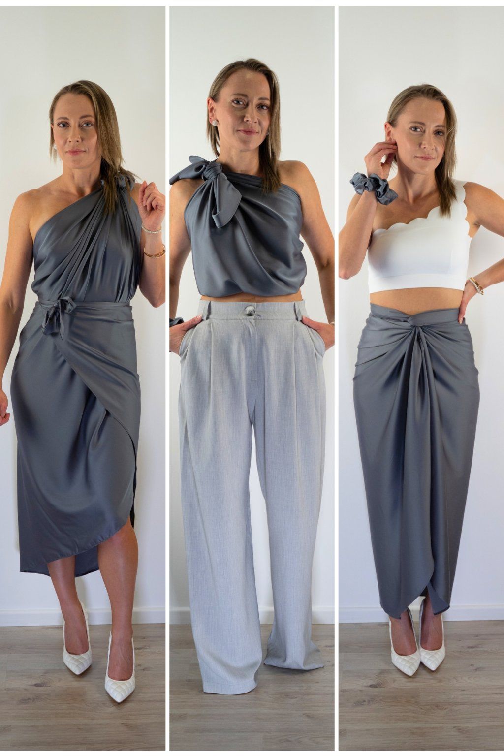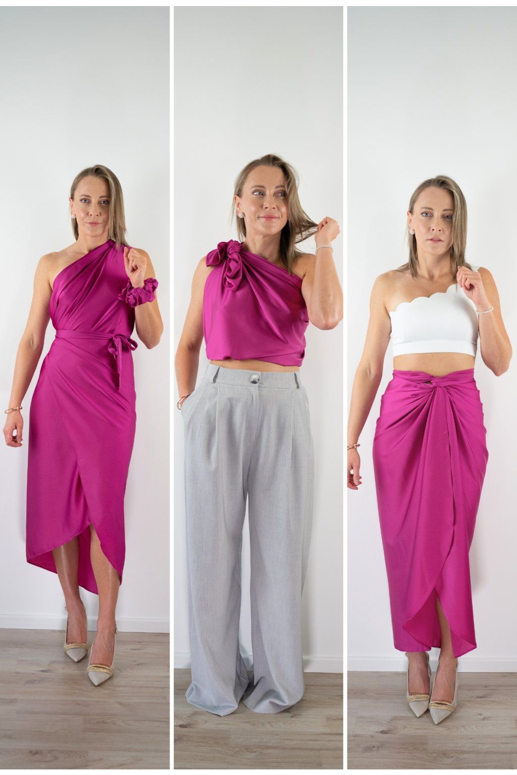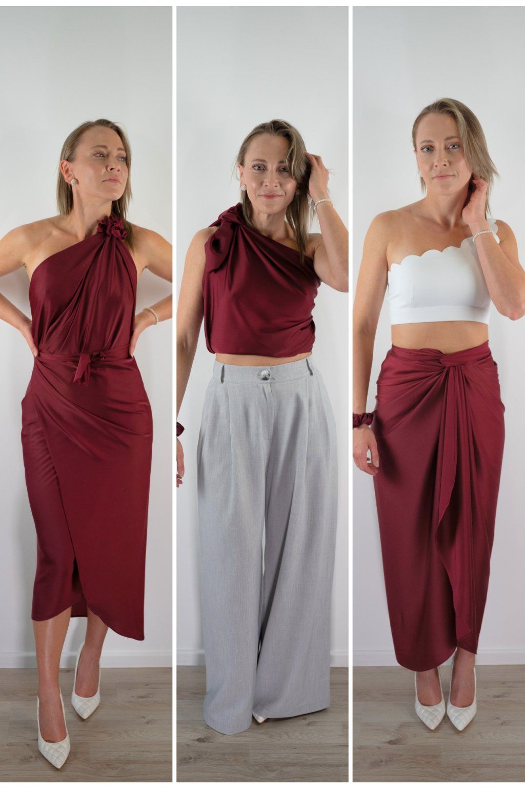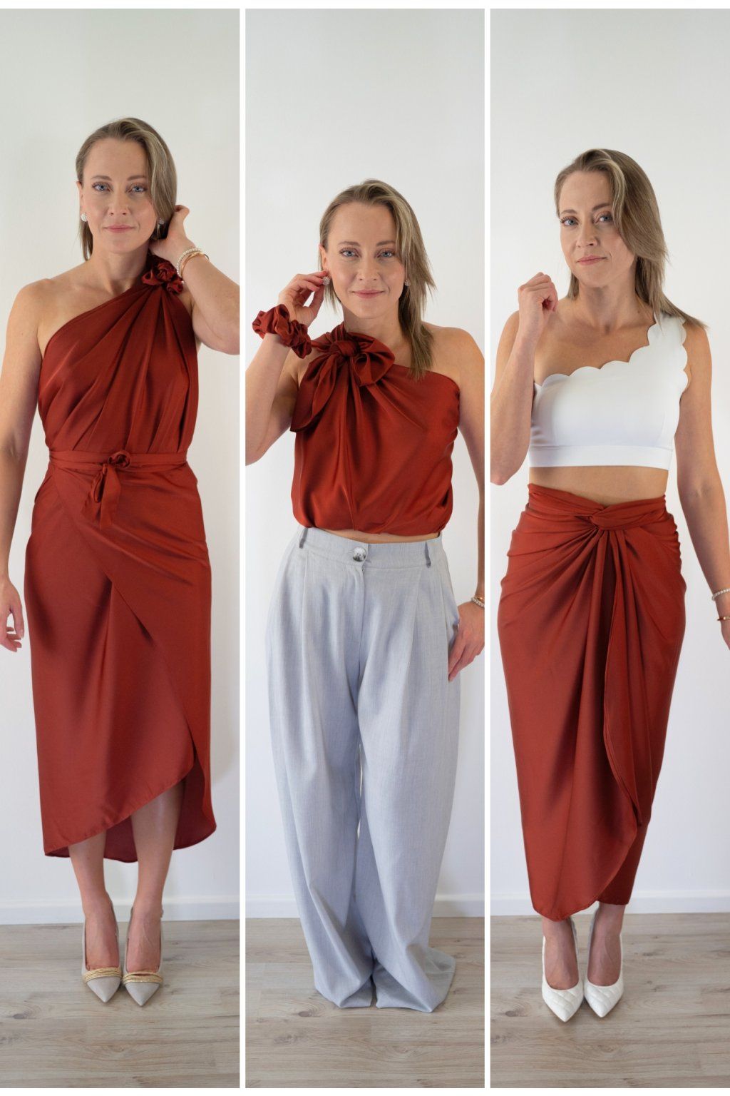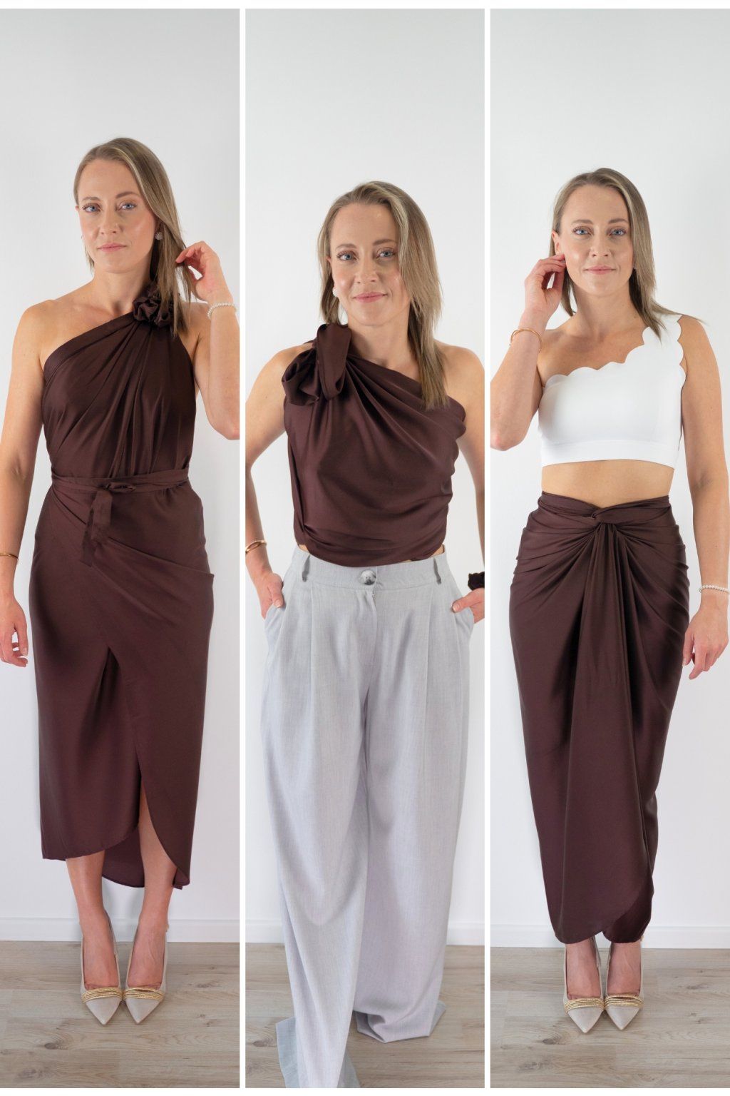 Multi-owl je jeden kousek saténu, který převážeš, přehodíš nebo uvážeš — a máš šaty na večeři, top do práce, sukni na rande nebo přehoz na pláž. Stačí jedna věc místo deseti.