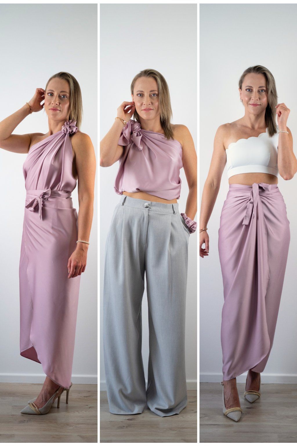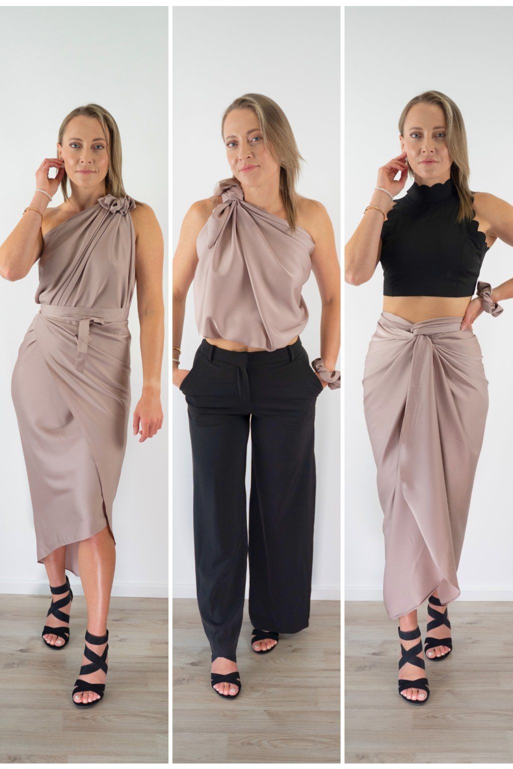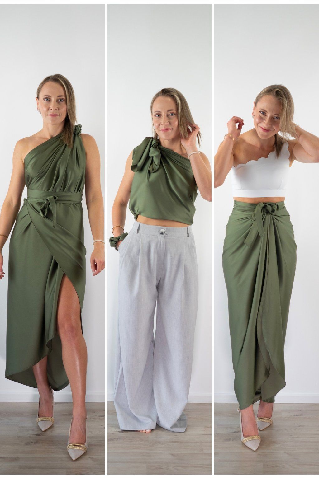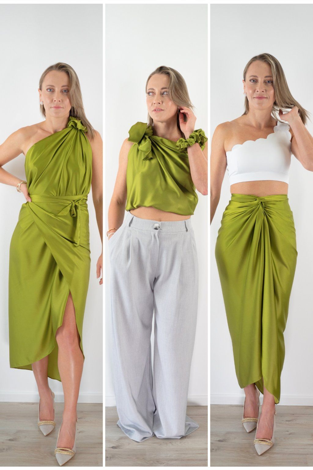 Multi-owl je jeden kousek saténu, který převážeš, přehodíš nebo uvážeš — a máš šaty na večeři, top do práce, sukni na rande nebo přehoz na pláž. Stačí jedna věc místo deseti.