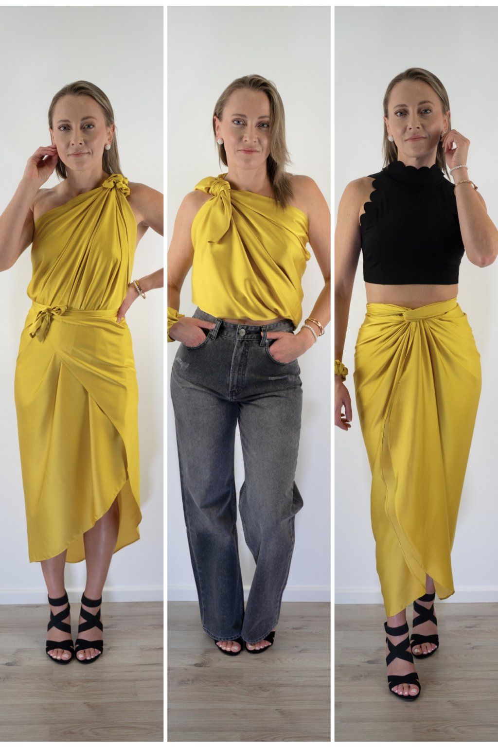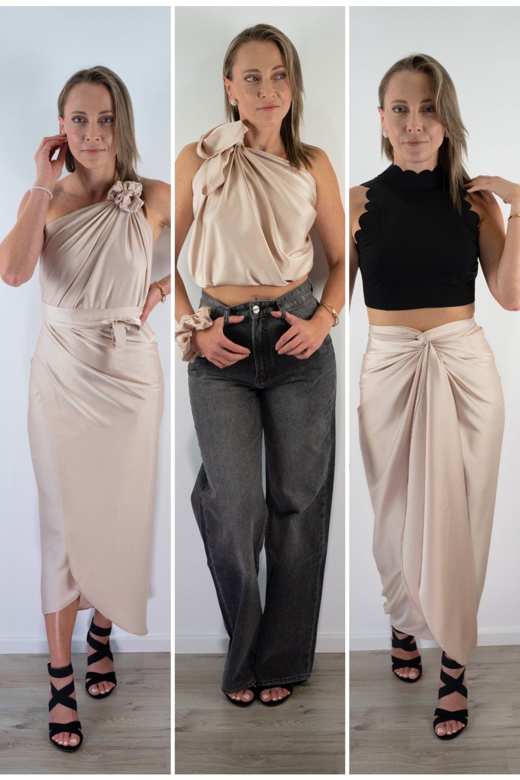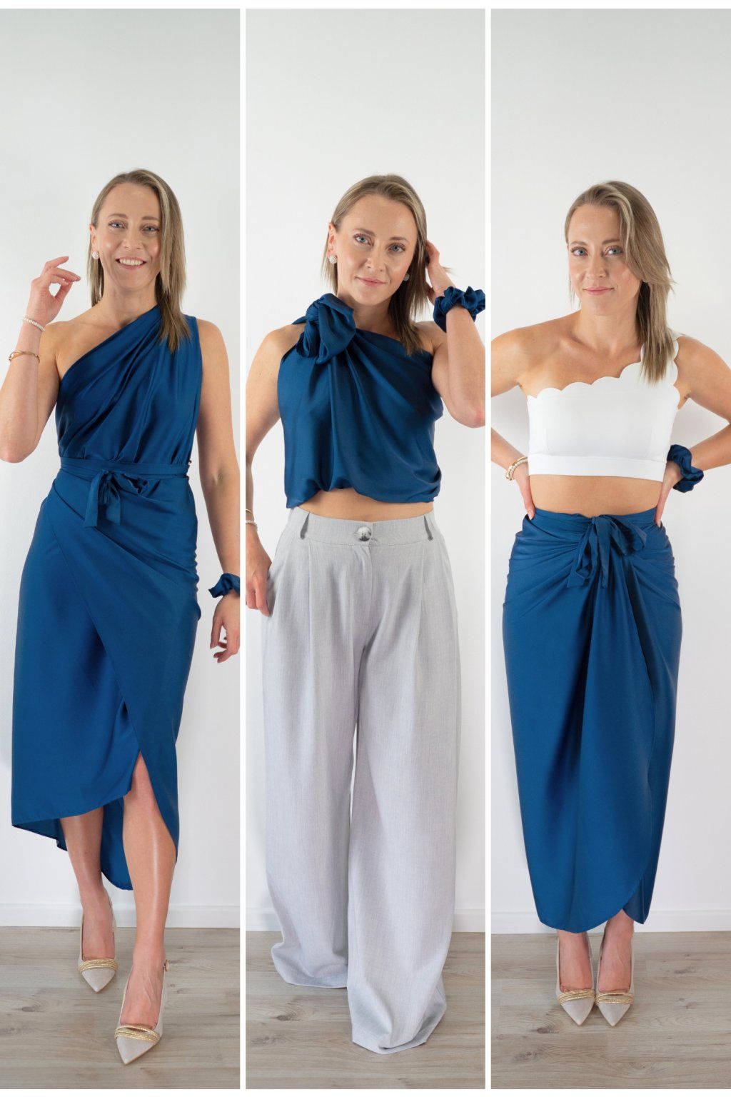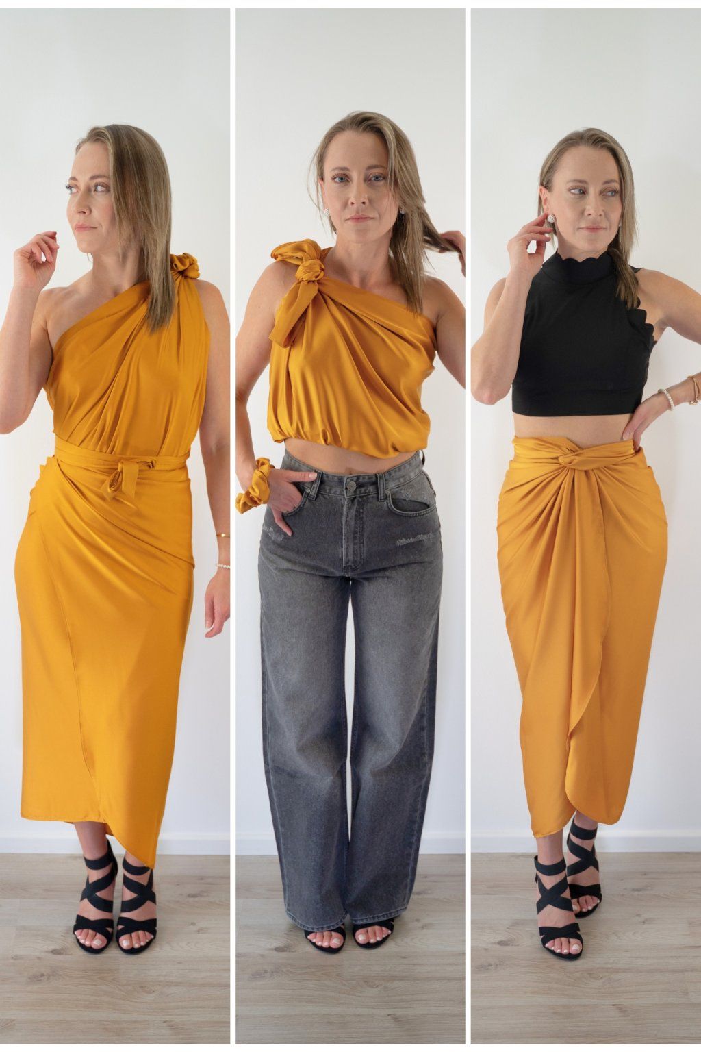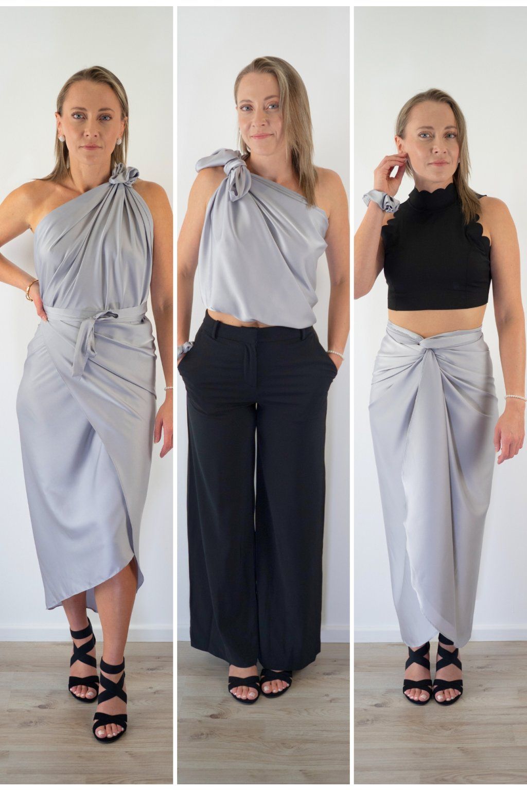 Multi-owl je jeden kousek saténu, který převážeš, přehodíš nebo uvážeš — a máš šaty na večeři, top do práce, sukni na rande nebo přehoz na pláž. Stačí jedna věc místo deseti.